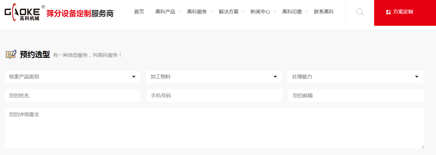 利用互聯(lián)網(wǎng)平臺,高科機械還推出在線預(yù)約選型服務(wù),您只需要打開高科機械官網(wǎng),在高科服務(wù)一欄中找到預(yù)約選型服務(wù),即可在線填寫設(shè)備使用的產(chǎn)品類別、加工物料種類及處理能力等信息,留下聯(lián)系方式后,我們的工作人員會在兩個工作日內(nèi)回復,為您提供科學合理的選型方案。